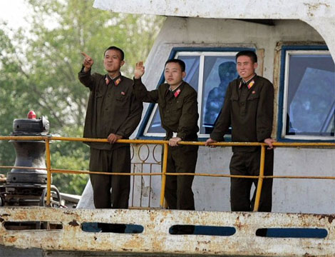 照片拍于昨日,朝鲜宣布进行核试验几分钟后,中国丹东边境鸭绿江船只上,三名北韩人民军士兵正在向美联社记者打手势。