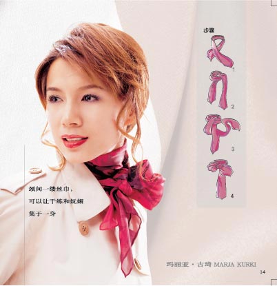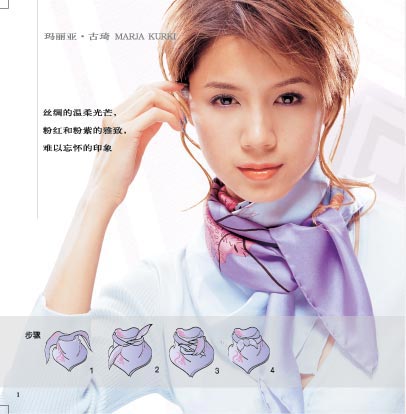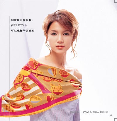 缀于肩上、领间、发际的丝巾,就像女人的情绪,总在不经意间轻轻流露。正是这种妩媚,使丝巾成为服饰中永不凋零的时尚,也正是这方寸间的微妙世界,深深吸引着每一位时尚、优雅的女士。不论出现在办公室、PARTY中、海滩上,丝巾,都是她生活秀的最佳拍档。她的衣服可以极简,但丝巾一定美不胜收。