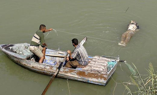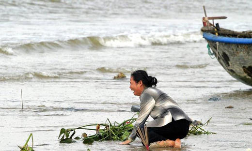 10, 沃什湾(英国东部)一个男子在触摸一只死鲸的长鳍。(10月5日)