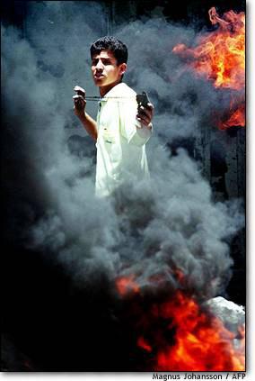 《中东在浓烟中闪光》一个巴勒斯坦青年躲在躲在燃烧着的路障后面,用他的小弹弓向以色列士兵射击。