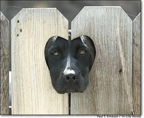 《初恋》一只年迈的叫水晶的黑色拉布拉多混血猎狗,从心形的洞中凝视着他的恋人。