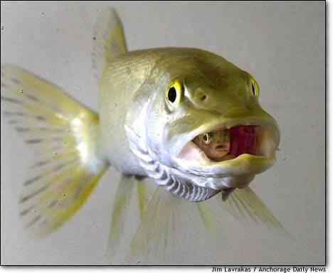 《活吞》一只虹鳟鱼从白斑狗鱼的喉咙里惊恐地向外看着,这是来自美国阿拉斯加州安克雷奇(美国阿拉斯加州南部的港口城市)水族馆的图片。