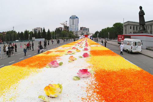 图片说明:俄罗斯伏尔加格勒表演者身着红、蓝、白不同色彩的衣服组成巨型俄罗斯“活人”国旗。