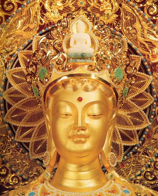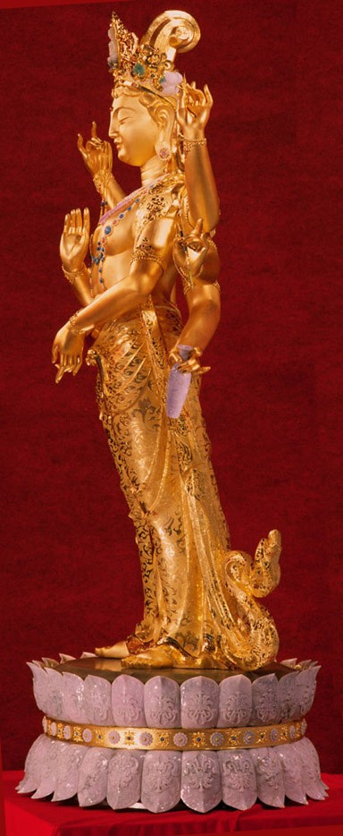国宝金玉观世音圣像是依据藏密经典《不空绢索神变真经》中对不空绢索观世音的描述而造。它以绢索为标志,法力无边,搭救六道众生从不落空。故金玉观世音又称不空绢索观世音。