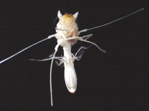 从中脊北部8万多深海生物中脱颖而出,个头非常矮小,眼睛半透明,触须处有大量吸管。嘴部形状表明其咀嚼能力极强。