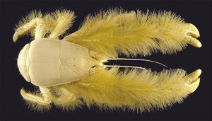 完全无视觉功能,身上布满黄色细菌群落。它不属于此前任何生物分类,在太平洋河床发现。生活在距南太平洋复活节岛1500公里的深海