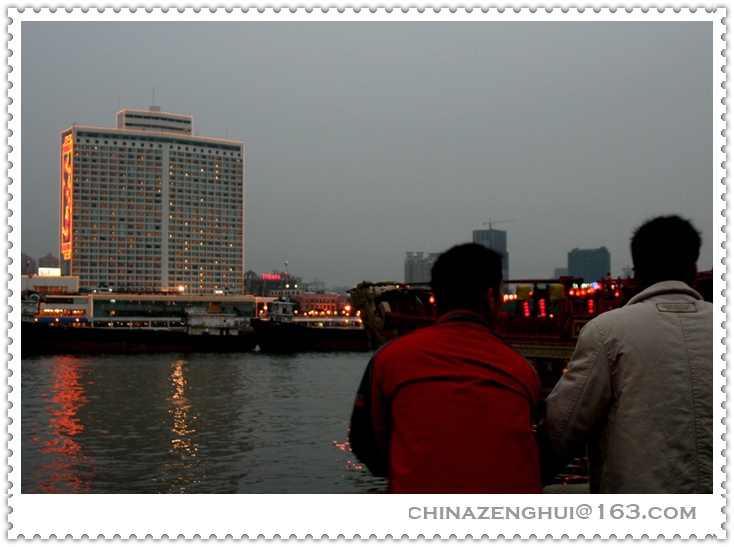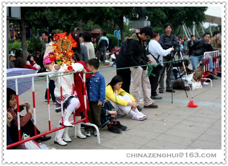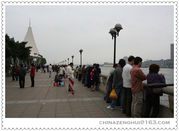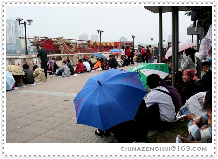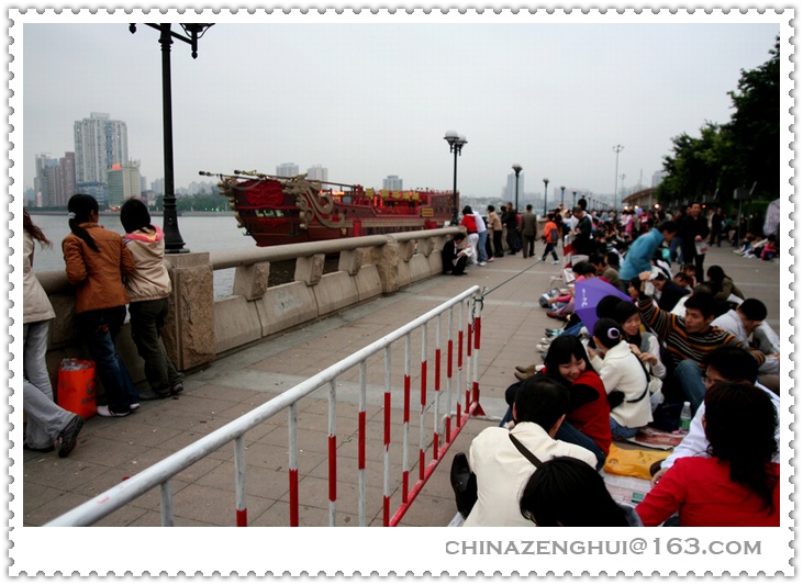虽然烟花要到晚上八点半才开始,为了选择好的位置观看烟花,人们早早就来到了江边,最佳的就是芳村风情酒吧一条街。原打算在沙面,发现最好的位置要有红卡。芳村的街到底还是老百姓的街,感觉比沙面位置更好。我四点多钟就来了,想到很快就有好几万人云集在此,没敢吃没敢喝,要坚持到十点钟呀。听说日本人就不怕,随身带有尿不湿……