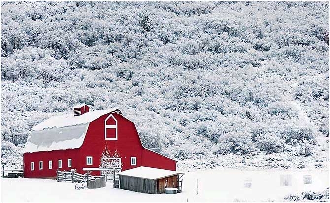 红与白的世界:11月14日,Colorado的阿斯潘附近,一座红色的农舍在彻夜的风雪过后被一片白色包围。我梦想中的房子,太美了!