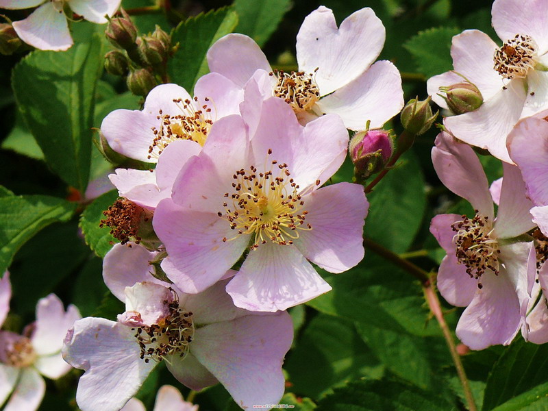 窗外隐隐传来一阵阵花香。一路寻去,一大片金樱子开着粉白色的花,引得蜜蜂忙个不停。