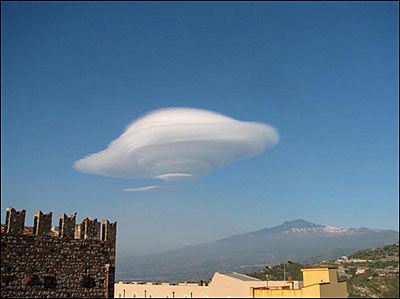 这是摄影师在山区拍摄到的云朵景观,晴朗的天空中出现了类似于不明飞行物(UFO)的云朵,远处看这个巨大的“UFO”云朵好像正在旋转着向地面降落