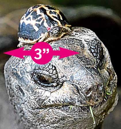 沃尔特,是世界上个头最小的龟,经常把哈诺维动物园35岁的巨龟奥托的脑袋当成自己的安乐窝。体型最大的龟身长可达43英寸(约1米),最小的只有3英寸(约7.6厘米)。