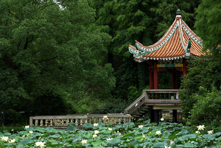 暴雨过后,园子被洗刷得一尘不染,树林青翠欲滴,池水清澈照人,亭榭好像也增添了色彩。游人稀少,显得格外静谧。这里的负离子含量可能是很高的吧!