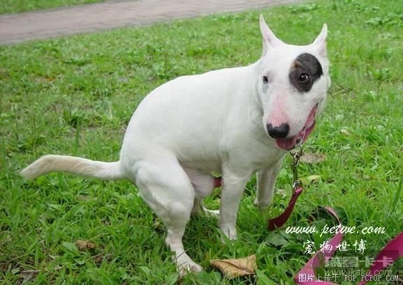 就是只海盗眼牛头梗,看它眼睛上的黑圈就觉得它一副欠扁无赖样~不管你心情多差看到它都会“噗”的笑出来~别看它个子小,可是很强悍的哦,他可是世界十大猛犬之一~在国外经常有牛头梗咬死牛的报道呐~