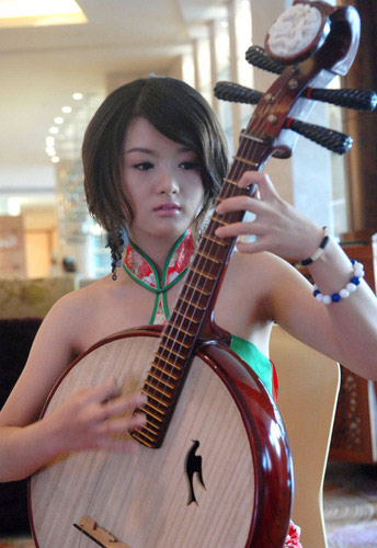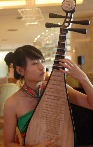 2008年8月5日,2008北京国际新闻中心大厅,五名身着中国传统服饰的年轻演员,在古香古色的中国风背景映衬下,用古筝、琵琶、二胡、阮等乐器,为前来北京报道奥运的中外记者弹奏中国民间乐曲,构成一道亮丽的风景。