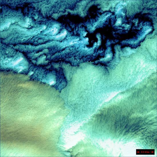从远远看去,这张照片好似一幅抽象画,但是,这张壮观的卫星照片的内容无非是沙丘、海藻,加上洋流的雕琢,给人浑然天成之感。褶沟起伏的水下沙丘很大程度上同沙漠沙丘的形成方式相同。