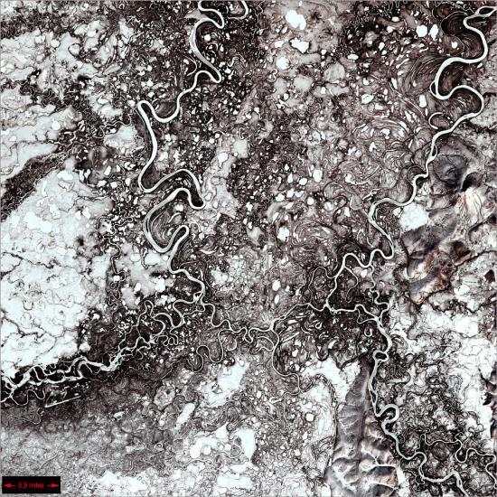 这幅照片是麦恩河(Mayn)流经人烟稀少的楚科奇州森林苔原地区的壮观轮廓。这个地区布满青苔、小灌木、莎草等植物。在这种恶劣的气候条件下,别的生物很难生存下来。麦恩河一年有9个月结冰。