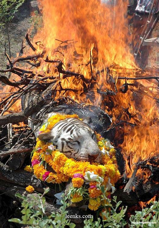 森林大火,老虎是遇难者,人们在缅怀它,将它火化。