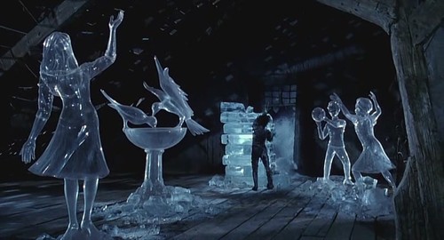 人们对爱德华的猜忌与流言发展到了不可收拾的地步,他一个人孤独的坐在街边,眼神依旧无邪。可是,愚昧的人们总是不肯放过他。爱德华走投无路之下,又逃回了山上的城堡。金找到了他,在城堡的窗边,当最爱的女孩站在他的面前,用企求的眼神望着他,说:“抱抱我,好吗?”他只是悲伤地看着自己的剪刀手指,说:“我不能。”那一刻他的眼神,让我悄然泪下……女孩走到他面前,轻轻靠在他的胸前,爱德华想起了自己未被完成的双手,想起了即使是最纯洁的灵魂也无法被救赎的命运。他轻轻地推开她,“Goodbye",一句再见,爱人永别,他被注定离开她,注定与世隔绝,他只能在空寂的城堡里守侯,在春天把花园收拾得鸟语花香,在冬天制造出千姿百态的冰雕,尤其是一位起舞的少女的仙姿,让翻飞的冰屑带着锥心的思念,羽化成轻盈的雪花,飘落在苍老中的爱人的窗前。从此小镇每年冬天都会下雪,已经年老的金相信是爱德华在默默地眺望着她的世界。[size=+0]