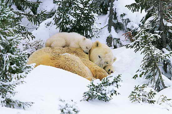 安迪-鲁斯称:“母北极熊会躺在一些小树上,北极熊幼仔会爬在它的身上,与它玩耍。看到这一切使我感到很美好。母北极熊对它的幼仔非常温柔,总是用自己的体温来防止它们受冻,容忍幼仔咬它的耳朵。”