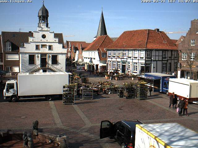 国外几乎每个城市都有对外公开的几处监控摄像,在网上实时地向大家展示所拍摄的场景。我现在给大家看的就是我曾经在那里读书的德国下萨克森州一个小城林根(Lingen)设在市中心广场上的一个实时监控录像,它是以jpeg格式每隔一两分钟刷新一次的,所拍摄的是林根市古老的市政府(那个白色尖顶、像教堂一般的建筑)及其附近的场景。