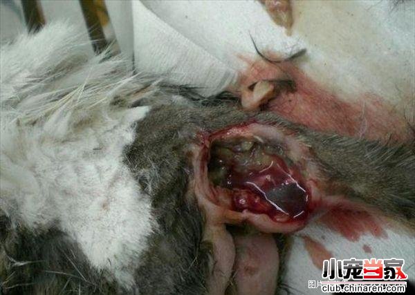 经医生初步检查判断,阿花体内有小猫残骸,但由于封住阴 户导致不能如期分娩,小猫在肚内已溃烂不成形,昨天又流出了小猫的体毛。但没打开腹腔,不排除体内有异物的可能。 烂在肚子里的小猫。