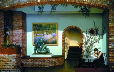约翰在加利福尼亚州圣何塞市一座咖啡馆墙上绘的三维壁画中,一个漂亮的女人正坐在一张圆桌前专心致志地看书,马路上车来车往的喧扰似乎对她毫无影响,她仿佛彻底沉浸在了书中的世界中。如果你忍不住被她吸引,试图走过去和她交谈,那你肯定会被碰得“头破血流”,因为这个忘我读书的美女只是一个“画中人”而已。
