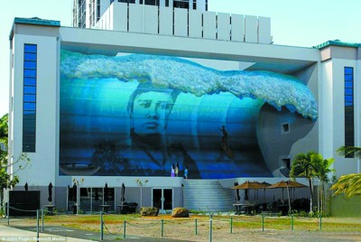 约翰还曾在美国夏威夷州檀香山市一座建筑的墙壁上画出了一幅十多米高巨浪扑向岸边3名儿童的壁画。