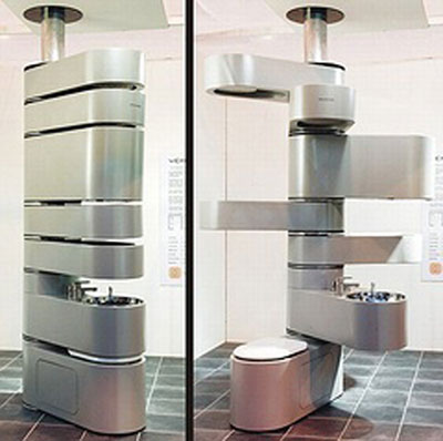 它名叫Vertebrae 由Odyssey 设计实验室设计,是一个组合式厕所+浴室。如图,他的所有功能都集成到一个柱面上,需要使用什么,便打开对应的模块(如图),最底下的是马桶,中间又洗手池,顶部还又淋浴头等等。功能多多,还节省空间。