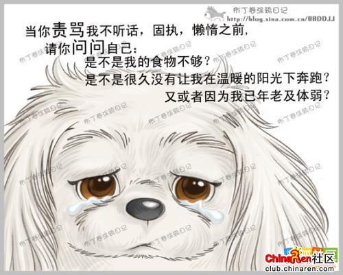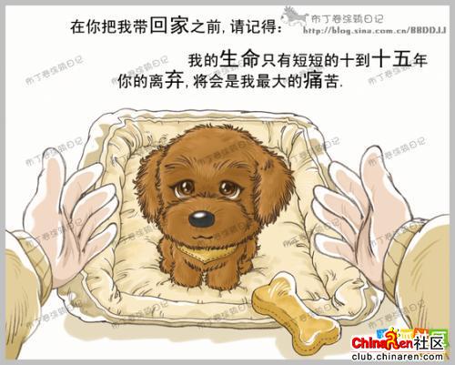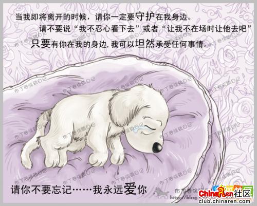 亲爱的朋友,看了以后你是不是跟我一样,感觉心里酸酸的?在短短十几年的岁月中,它只是你的宠物,而你,却是它的全部!所以,请各位正在养狗的朋友好好善待他们,不要经常打骂,让他们有个舒适的生活空间;那些准备养狗的朋友也一定要考虑清楚,这不是买玩具,而是一条生命,它将在今后的十几年中永远陪伴着你!我想,这样的帖子有必要转一下。