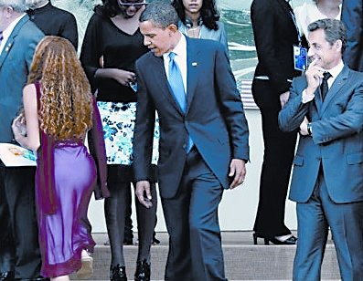 当地时间2009年7月11日英美媒体热炒一张G8峰会上的照片,照片疑是美国总统奥巴马“偷窥”一名巴西金发美女臀部,站在一旁的法国总统萨科齐一脸坏笑。美国广播公司用录像视频证明奥巴马的清白:他当时压根没有故意偷窥美女臀部;相反倒是站在一旁的法国总统萨科齐伸长脖子,眼神随着美女臀部波动。