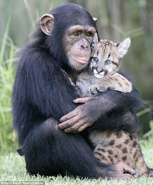 据报道,“安佳娜”来自美国南卡罗来纳州一家珍惜濒危物种保护中心。在专家指导下,这只黑猩猩很快学会了如何照顾大型猫科动物的幼仔。“安佳娜”能认真的给小美洲狮孤儿“塞拉利昂”喂奶,还在小狮子害怕时用手臂抱住它、抚慰它,所作的一切尽显母性光辉,成为动物园中人类管理员的好帮手。