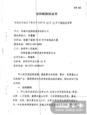 而在一份没有合作双方签名盖章的《合作框架协议书》中,也详细介绍了双方合作的一些细节。这份印有“绝密”的《协议书》显示,合作甲方为“香港中旅国际投资有限公司”,乙方为“登封市人民政府、河南省嵩山风景名胜区管理委员会”。“乙方负责组建由登封市人民政府主要领导牵头的专门服务协调工作组,协调、处理合作过程中和合资公司运营过程中遇到的问题,确保甲方享受当地招商引资、河南省文化改革发展试验区等方面的优惠政策,为甲方在登封投资营造良好的环境。”甲方从2010年开始,在未来三至五年内通过各种方式和渠道为合资公司投融资8亿-10亿元人民币。
