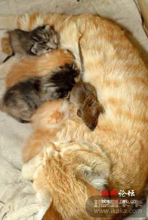 镜头回放:方形的纸箱中有5只尚未满月的小猫,三黄两黑,而在这些小猫中间,果然藏着一只灰色的小老鼠。此时,猫妈妈正慈爱地看着自己的"子女",而对于这只猫群中的"异类",猫妈妈显得格外宽容,任凭小老鼠在自己孩子身上爬来爬去,猫妈妈竟然视而不见。而这只小老鼠也格外大胆,竟然堂而皇之地在猫妈妈的怀里钻来钻去。(4月12日《燕赵都市报》)