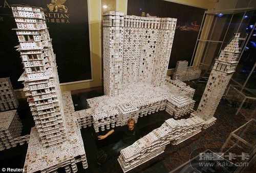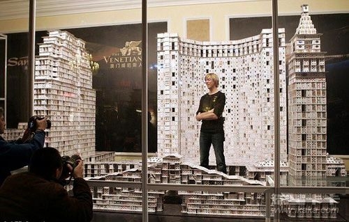 贝格此次耗时44天用218792张扑克牌(4051副扑克牌)堆叠除了澳门威尼斯人度假酒店、澳门百利宫和澳门金沙三座纸房子建筑物。
