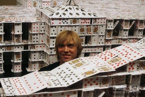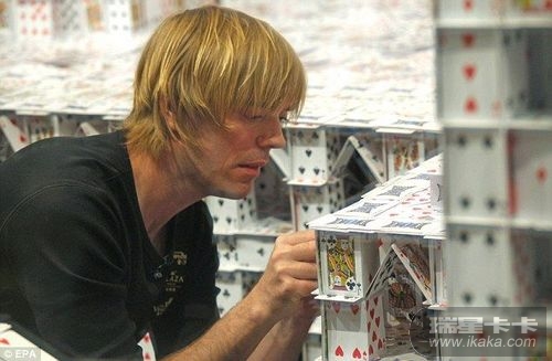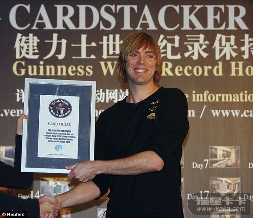 美国建筑师贝格在澳门威尼斯人度假酒店成功打破自己之前保持的“世界最大型扑克牌建筑”的吉尼斯世界纪录。