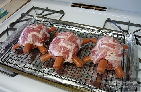 答案是:龟。做法是:牛肉片加奶酪编织成团,然后插上六个香肠,并适当修理下香肠的形状。