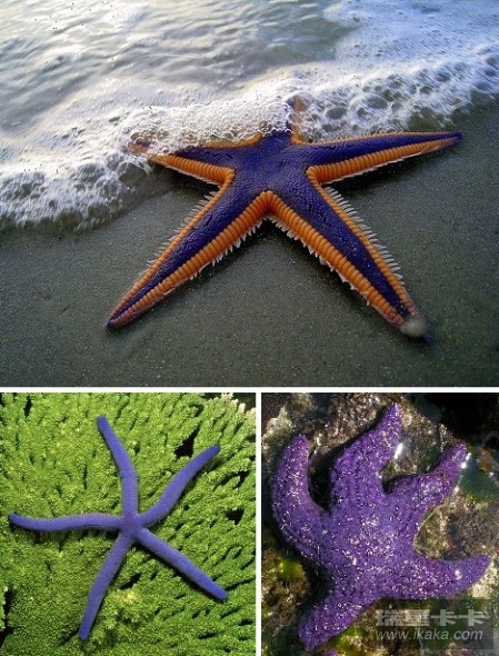 海星有许多种,呈现出不同的颜色,包括令人惊奇的紫色。一些海星之所以呈现神奇的紫色,其中原因可能是由于蓝绿色海水过滤掉阳光光谱中的红色部分,因此在陆地上呈现紫色的海星在水下看起来更加隐蔽。