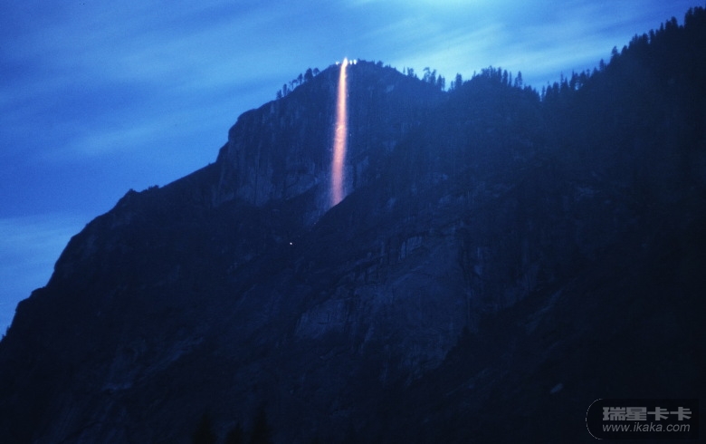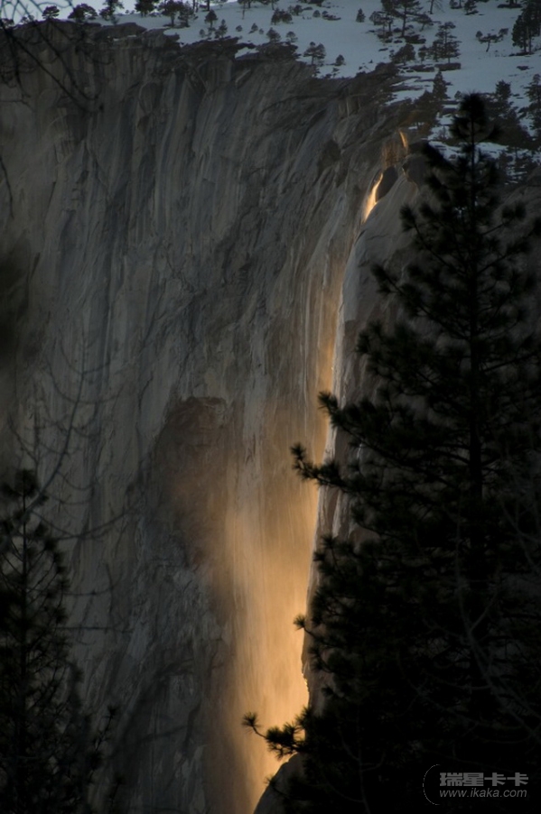 其次是太阳的角度。太阳的位置必须正好将光芒覆盖在这个瀑布上。而合适的太阳角度只出现在每年一月、二月的晴天的傍晚。如果天上有云、有其他东西,你就只能看瀑布和自己脸上的瀑布了。不幸的是,二月份正好是国家公园天气比较无常的月份。基于这些苛刻的条件,成功拍摄火瀑布的照片并不多