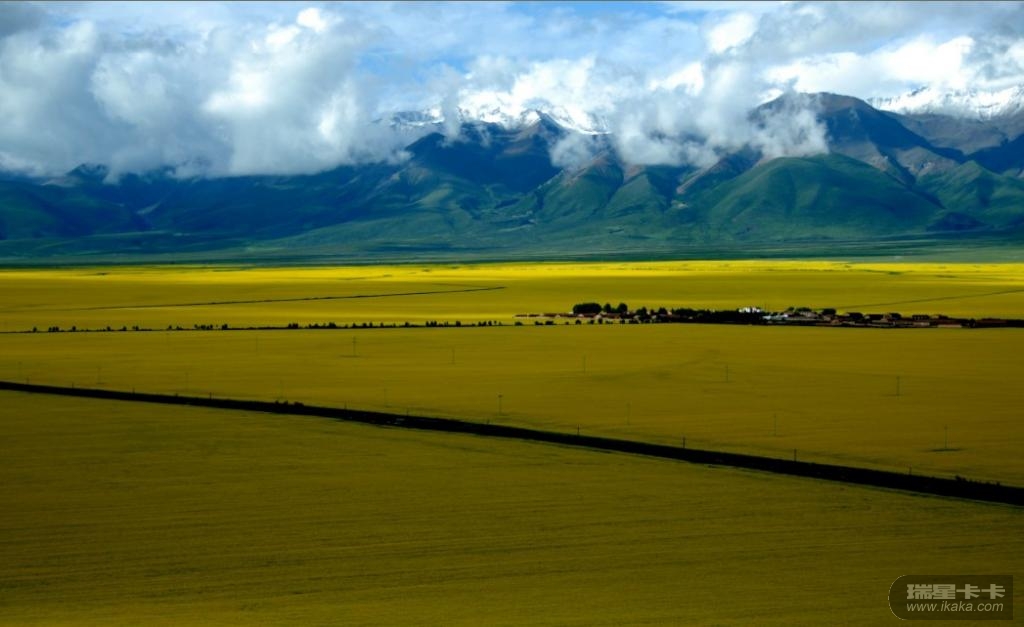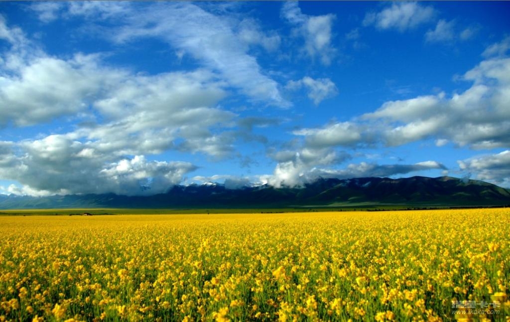大半圈湖岸,足有百万亩,在高原深蓝的天空下,繁花金黄一片,嵌镶在湛蓝的