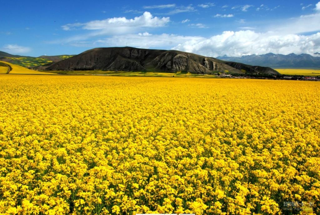 在高原上常见的蓝天白云衬托下,一望无际的金黄显得异常斑斓,令人慨叹。据一些艺术家说,不少油菜花风景画多取材于此般地貌的油菜花地,大色块的简单构图给人丰富的遐想。