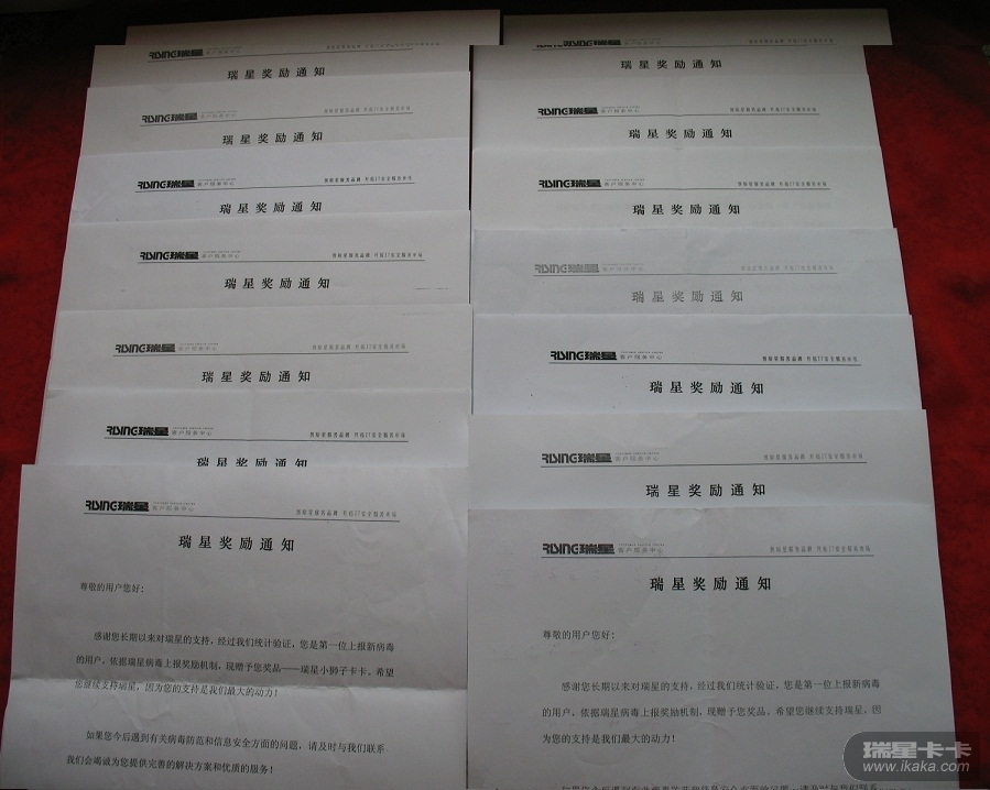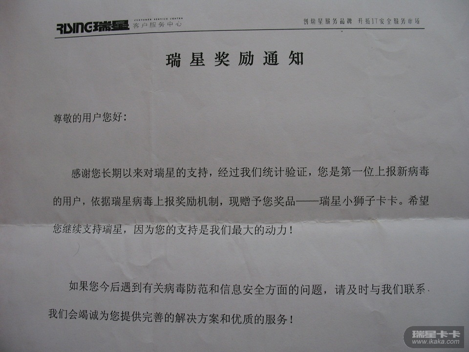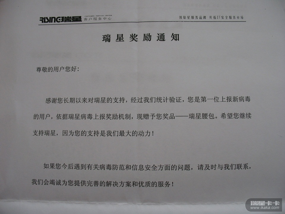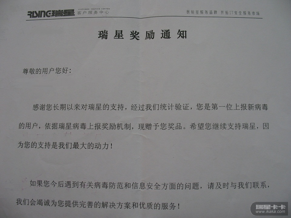 今天整理物品,发现了前几年上报样本瑞星寄来的信件,两年多没玩了,想想,还是比较怀念当年捉虫的日子。