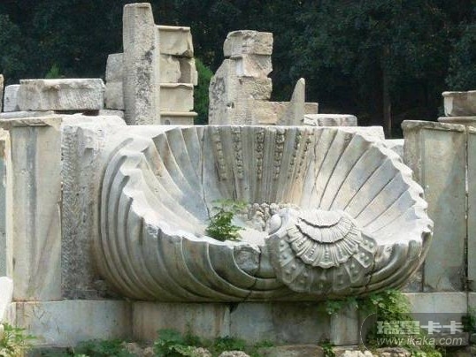 贝壳,据说散落的十二生肖兽首原来就成列在两边的。十二生肖时钟位于喷水池四周,圆明园被毁后生肖铜像全部丢失。