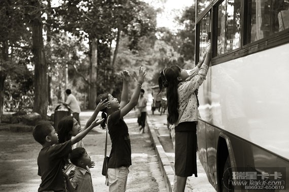 在吳哥城古蹟群之間,多的是販賣鑰匙圈、光碟、旅遊書、花色披肩、木雕等紀念物的攤販圍著觀光客糾纏兜售,但也隨處可見或玩耍或發呆凝望,衣衫襤褸的幼童跟著做生意的父母或兄姐在附近,有的已經開始學會乞討,而且是多國語言,見到東方人會說中文或日語,見到西方人會說英語,有的孩在玩耍不知世事的年紀,不分男女童,光腳丫打赤膊,來回在奔跑通往景區間的泥土道路上。