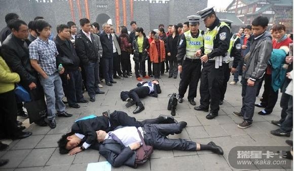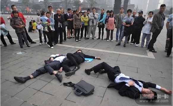 四个西装笔挺的年轻人醉倒在地上,引来市民围观。据了解,四名年轻人是来参加某公司招聘销售人员复试的,其中两位是即将于明年毕业的大学生。中午领导请吃饭,他们拼命喝酒挣表现喝醉了,几人先是坐在地上聊天,一会儿后三人躺倒地上不动了。还有一个靠着旁边的电线杆摇摇晃晃地站着,偶尔说些听不懂的话,并且不停地抽搐。