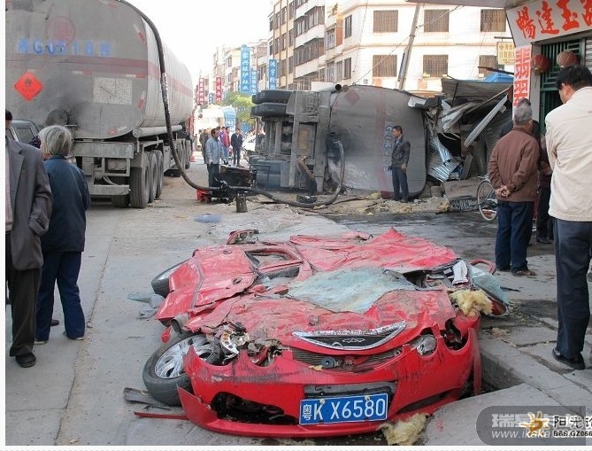 油罐车侧翻压扁小轿车 无人员伤亡(图)
