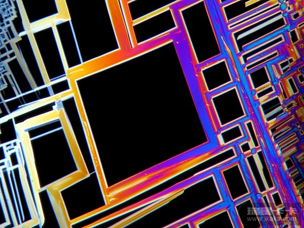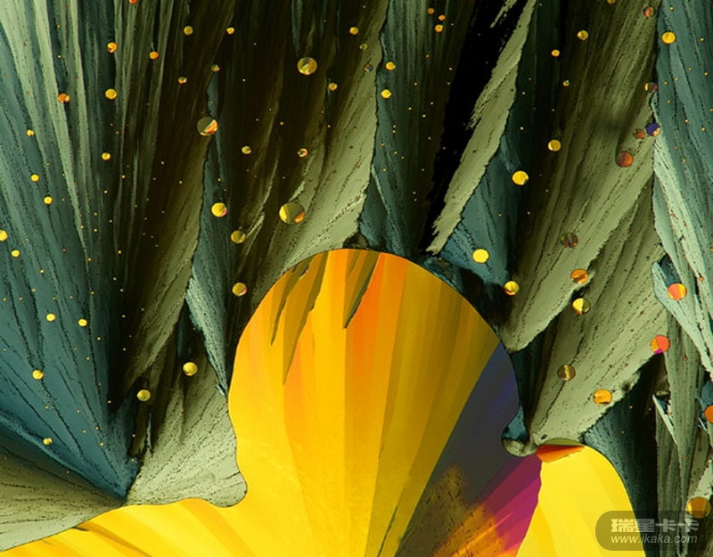在偏振光下,放大10倍后,取自地衣植物的酸性物质清晰可见。据挪威奥斯陆自然历史博物馆介绍,这个地衣种类Evernia divaricata分布于欧洲、北美、中亚生长缓慢的针叶林。它们会长出碗状子实体,与嫩黄色的孢子连在一起。这张照片是德国杜塞尔多夫的摄影师拉尔夫•瓦格纳(Ralf Wagner)拍摄。他在一个论坛上发帖说,照片显示的酸性物质发现于整个地衣上,其形成的矩形晶体结构是这种酸性物质的“典型特质”。