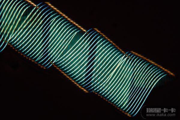 在这张由英国乌尔斯特大学的斯蒂芬•洛里(Stephen Lowry )使用偏振光技术拍摄的照片中,香蕉根茎的螺旋形导管闪着光芒。照片放大了32倍。