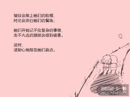 皱纹会爬上她们的脸颊,时光会染白她们的鬓角。她们开始记不住复杂的事情,走不大远的路就会感到疲惫。这时,请耐心的陪在她们身边。