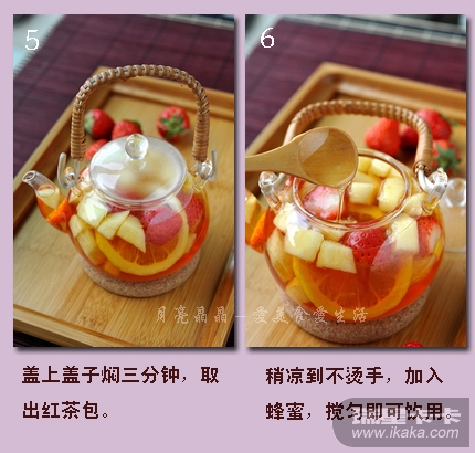 【材料】:各种水果、柠檬一个(用两片)、红茶包一个、蜂蜜适量。