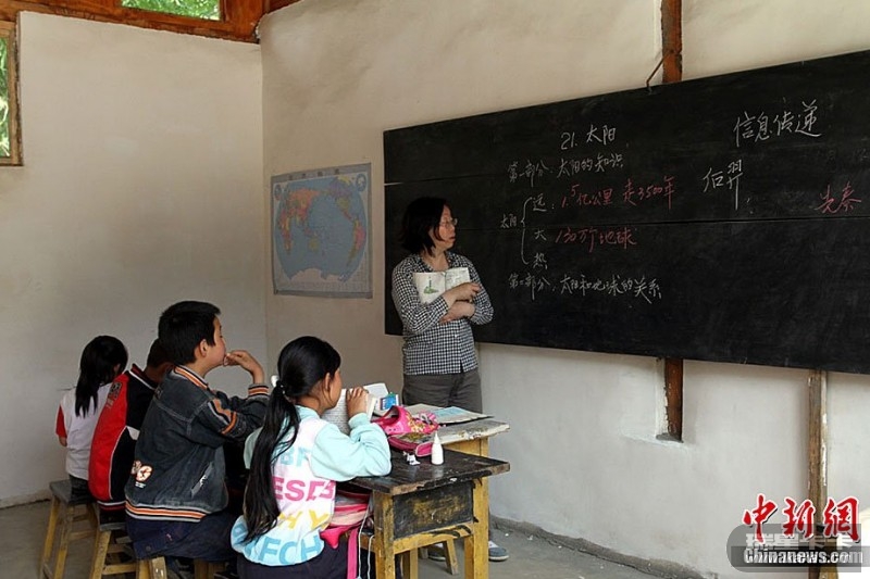 在甘肃陇南文县中庙乡茶园村,有一所只有七个学生的小学校。学校唯一的一名正式教师赵阳春告诉记者,他是去年8月到茶元小学任教的,可以说与学校“同龄”。在汶川地震后,该所学校由甘肃省绿驼铃环境发展中心援建,于去年9月正式招生。学校招收的7名学生都是茶园村的,目前只有7名,分为一、四年级和二、三、五年级两个班。由于教师缺乏,目前他上数学课,另外一名来自南京的志愿者陆燕上语文课,其他的课则由两人轮流带。此外,利用资源,这里还接收了7名学前班的小朋友,共同组建了一个大家庭。图为志愿者老师在为学生们上课。